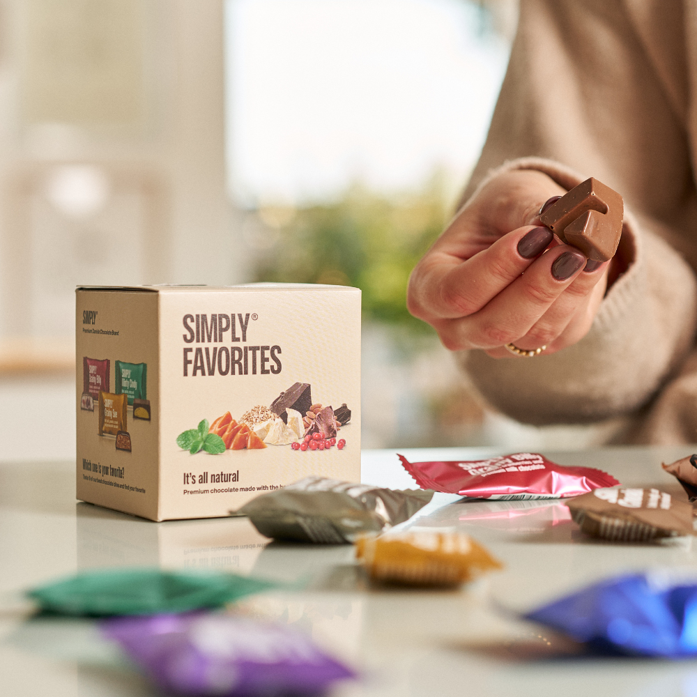 Hos Simply® elsker vi naturlige ingredienser, og vi går langt uden om kunstige sødemidler, aromaer og farvestoffer. Vi er nok lidt kræsne, når det kommer til vores ingredienser. Naturen er vores vigtigste allierede – smag og kvalitet betyder alt for os. Altid. Vi bruger meget tid på at finde nye og spændende smage, og vi vil gå langt for nye innovative muligheder, men vi går aldrig på kompromis med god smag. Dette er vores kærlighed til naturlig chokolade.