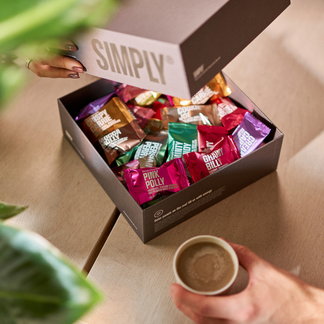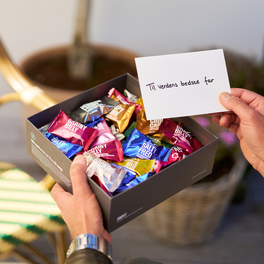 Udforsk Simply® universet sammen med din far og smag jer igennem hele vores familie af premium chokoladebarer samt proteinbarer. Nyd hele 12 forskellige varianter - pakken indeholder 2 af hver. God fornøjelse!