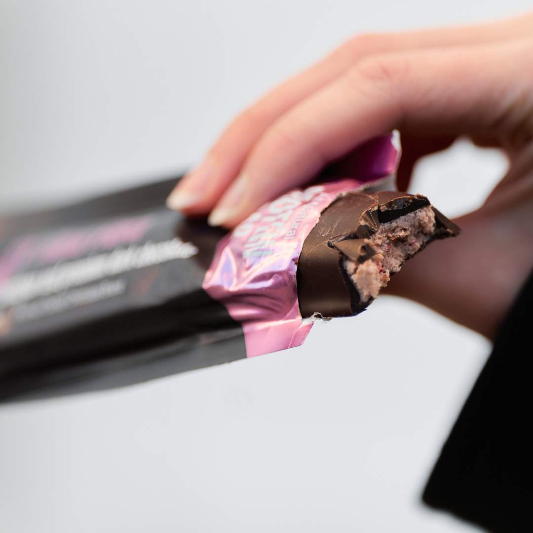 Mød Flexi Flora! Inde bag sit fine ydre finder du et tykt lag premium mørk chokolade og et indre af syrlige hindbær og blød marcipan. Glæd dig til 23% protein uden kompromis på smag og kvalitet.