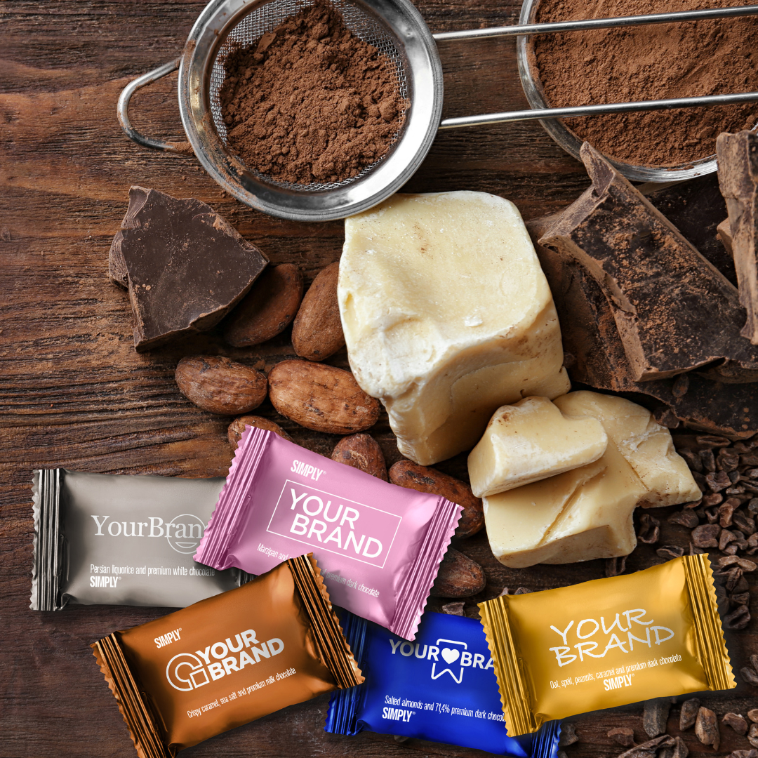 Dit logo på vores premium chokolade? Design jeres helt egen chokolade med lige netop jeres brandfarver, logo og statements. Vi skræddersyer den perfekte løsning til jer. Opret dig som erhvervskunde og hør meget mere.