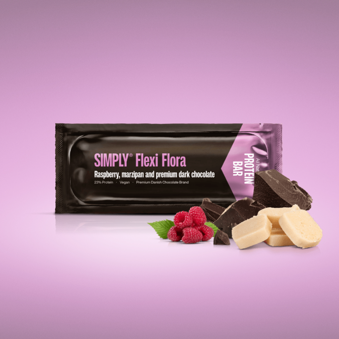Mød Flexi Flora! Inde bag sit fine ydre finder du et tykt lag premium mørk chokolade og et indre af syrlige hindbær og blød marcipan. Glæd dig til 23% protein uden kompromis på smag og kvalitet.